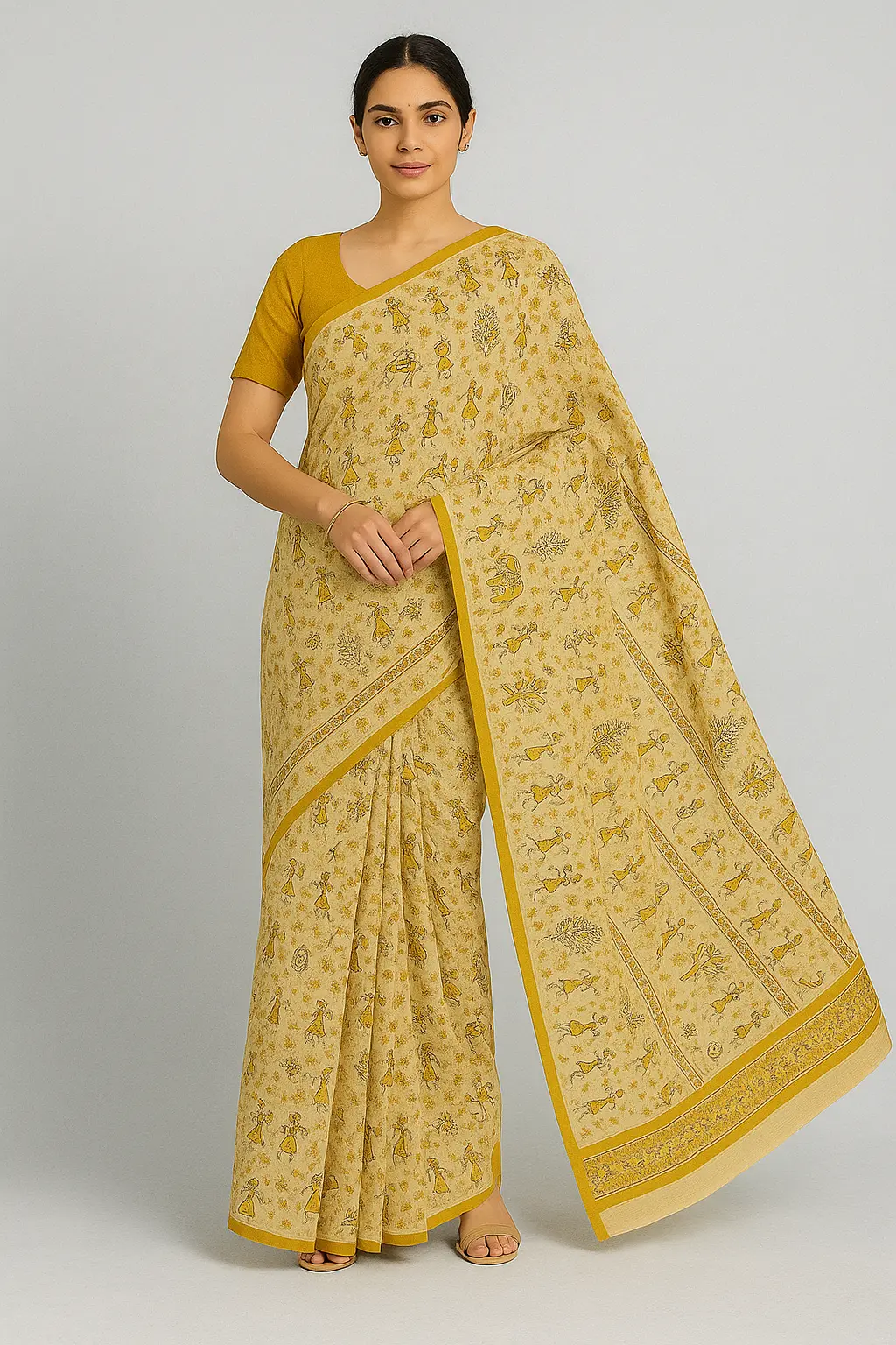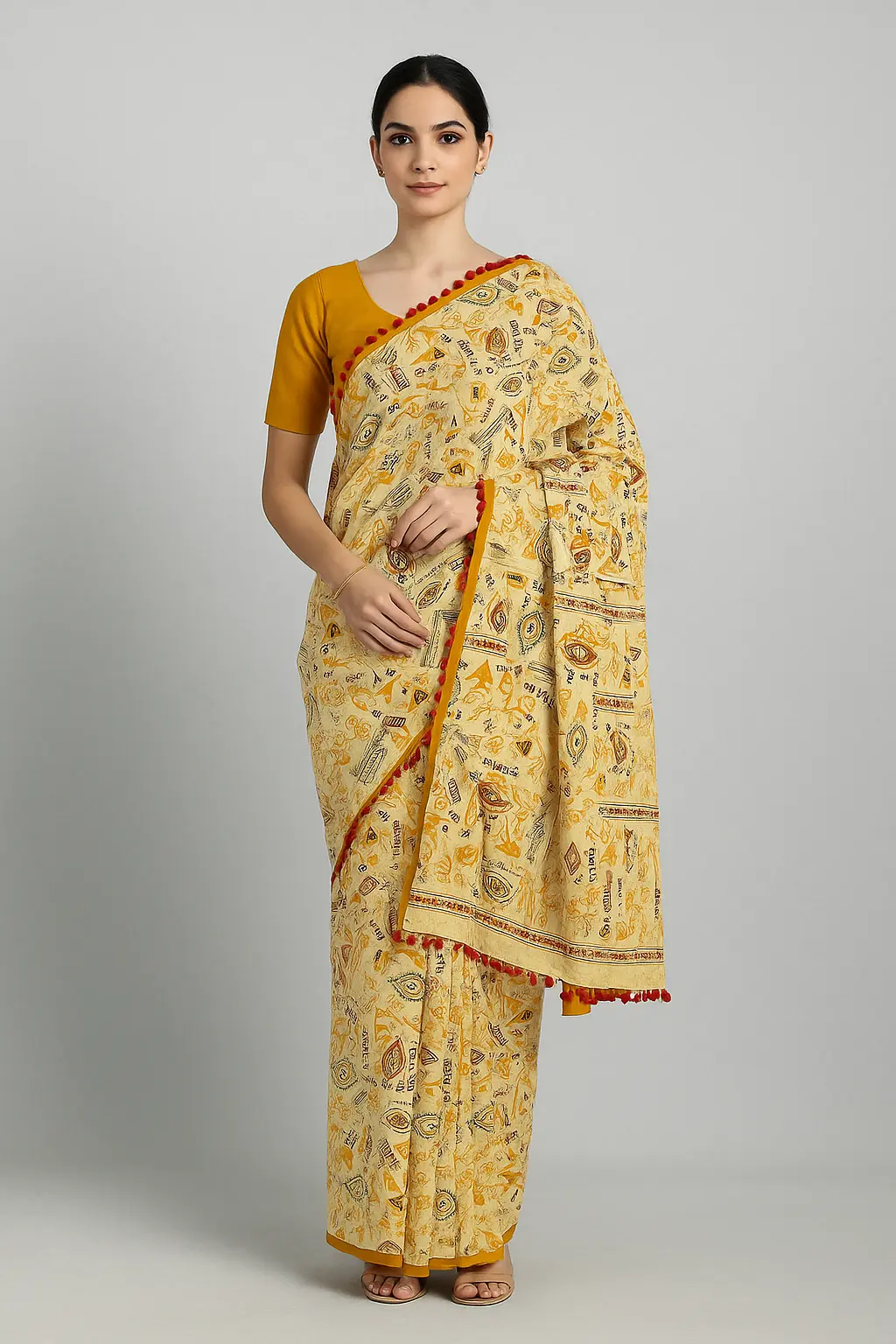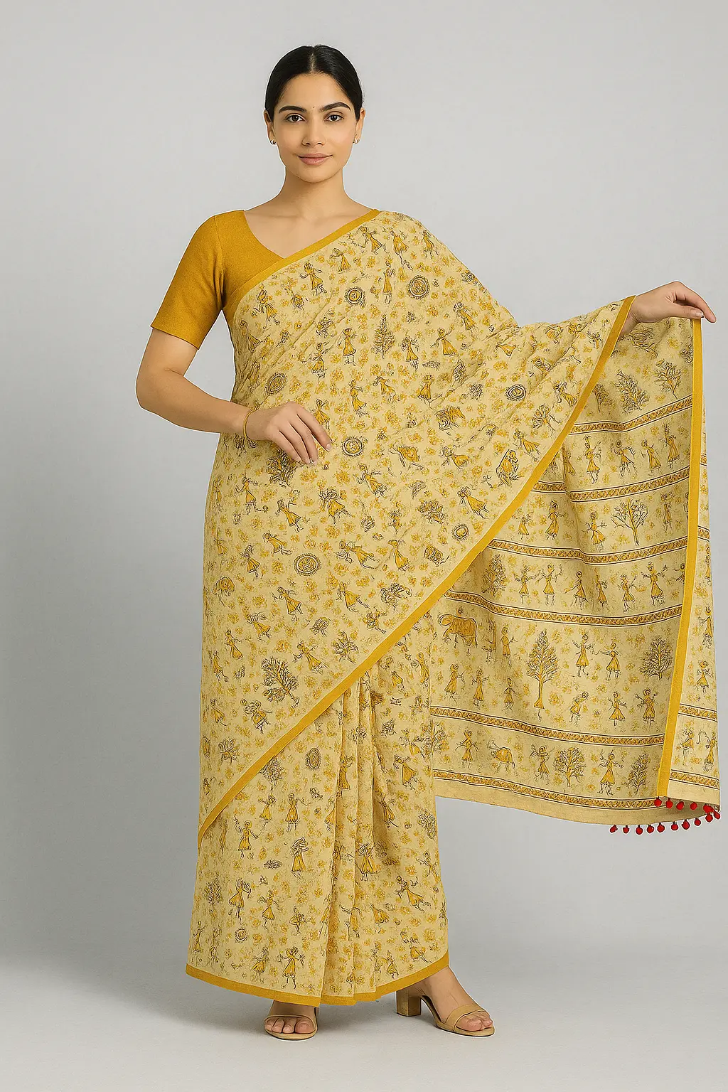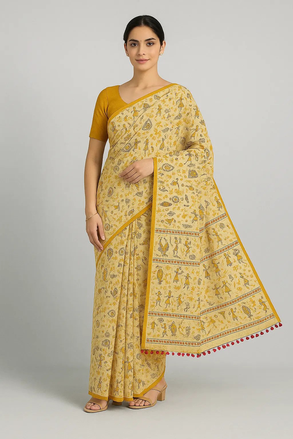 Cream & Mustard Warli Print Cotton Saree features a beautiful blend of traditional tribal art and modern minimalism. The soft cream base is adorned with intricate mustard and black Warli-inspired motifs, giving the saree a vibrant ethnic appeal. Made from lightweight, breathable cotton, it offers all-day comfort and a graceful drape. The pallu is finished with bright red pom-pom lace detailing, adding a playful touch to the overall look. Perfect for casual wear, office days, festive gatherings, or cultural events, this saree balances elegance, tradition, and everyday ease with style.
